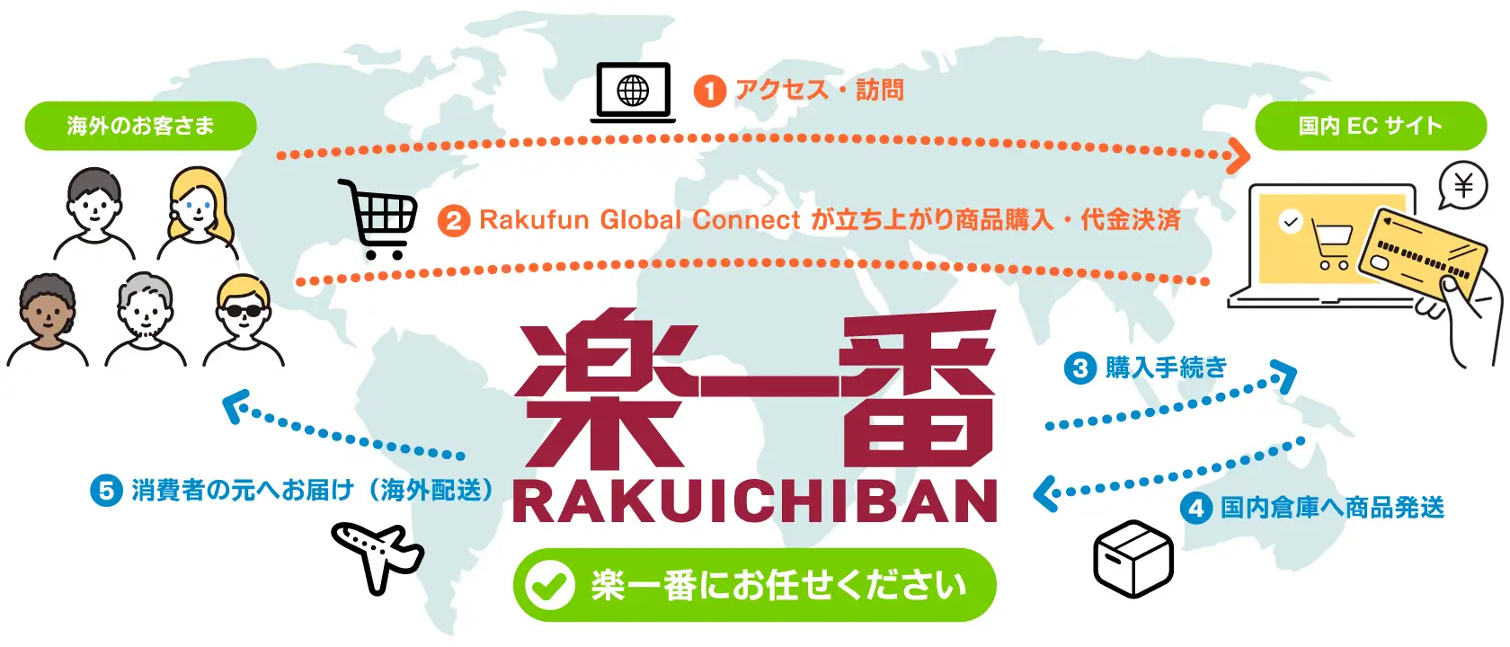 そこで楽一番は、全世界200万人以上の会員様に安定的にご提供してきた代理購入・海外配送サービスの基盤を活かし、国内EC事業者様が「今のECサイトのまま」「コストをかけずに」「手軽に」海外販売を始められる仕組みとして、「Rakufun Global Connect」を開発いたしました。